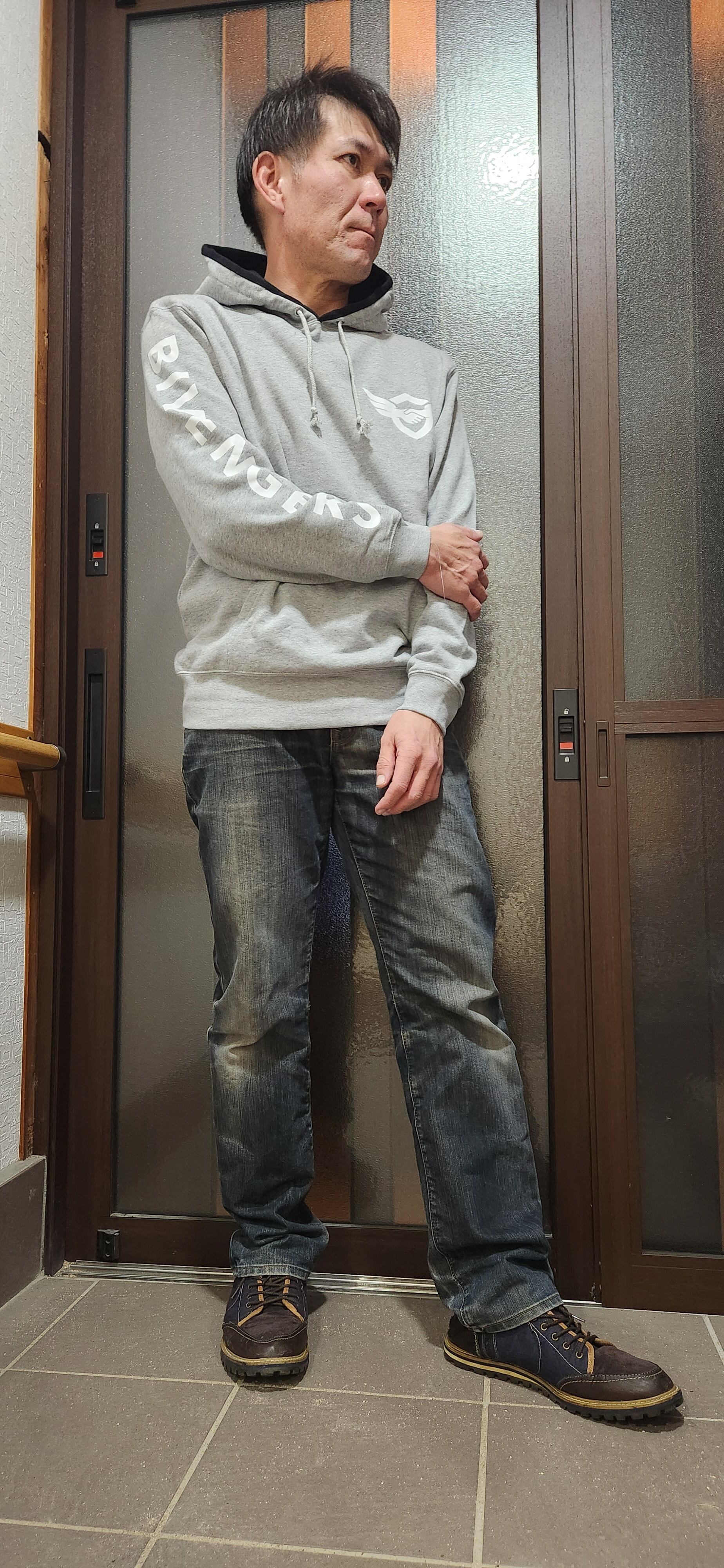 画像で着用しているサイズはLサイズ、身長176cmでジャストサイズくらいです。